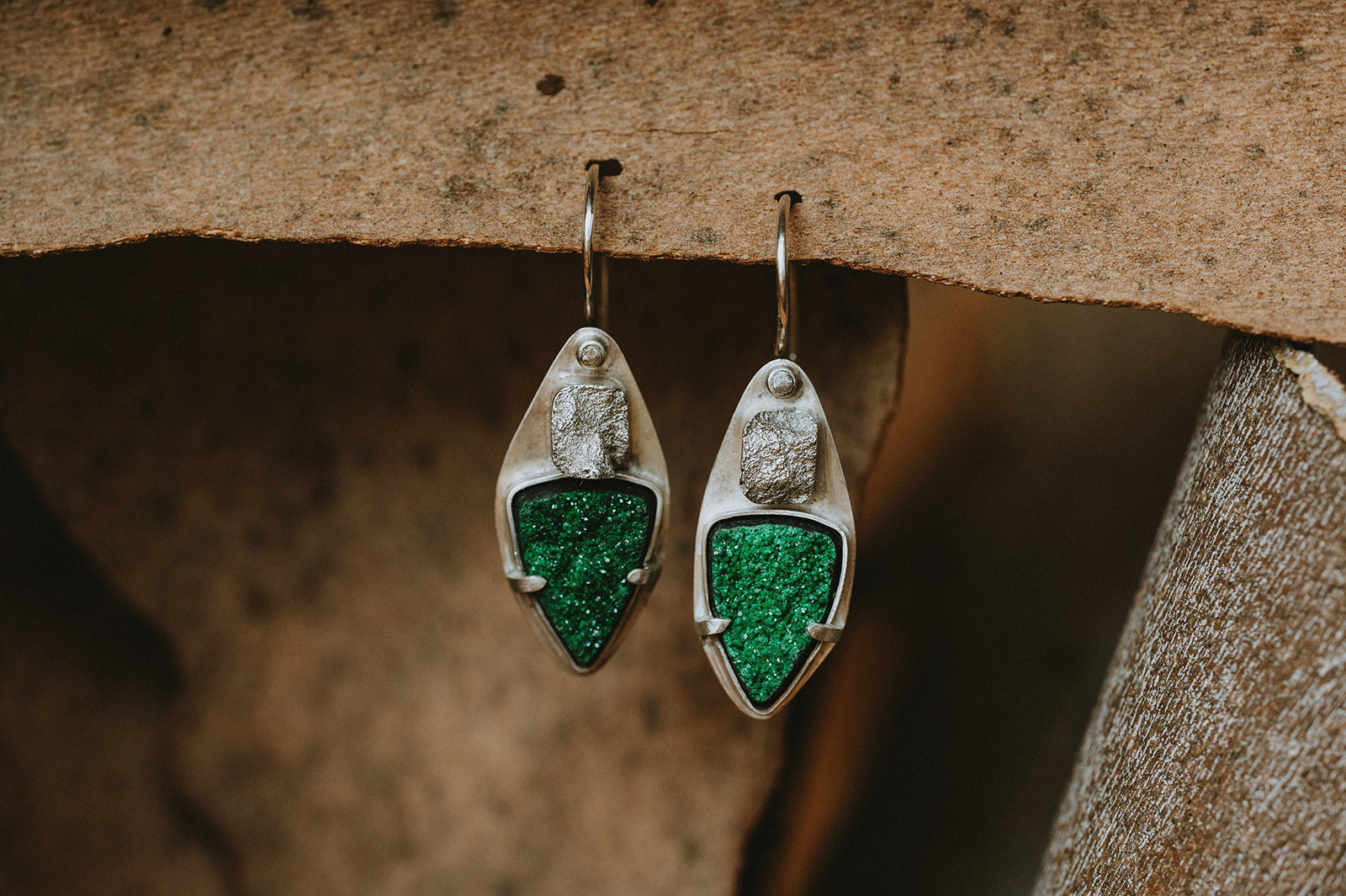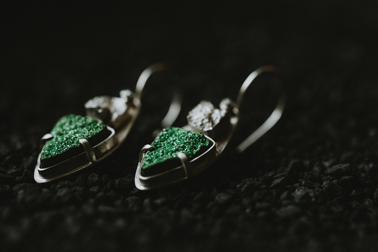 The ever-popular Uvarovite Garnets, this time in an earring option! These Broken Uvarovite Garnet Earrings are the first time Zink Metals has used these stones in earrings. The sparkling, textured unique green stones are accented by our signature broken silver. These small but unusual earrings are sure to be a standout.