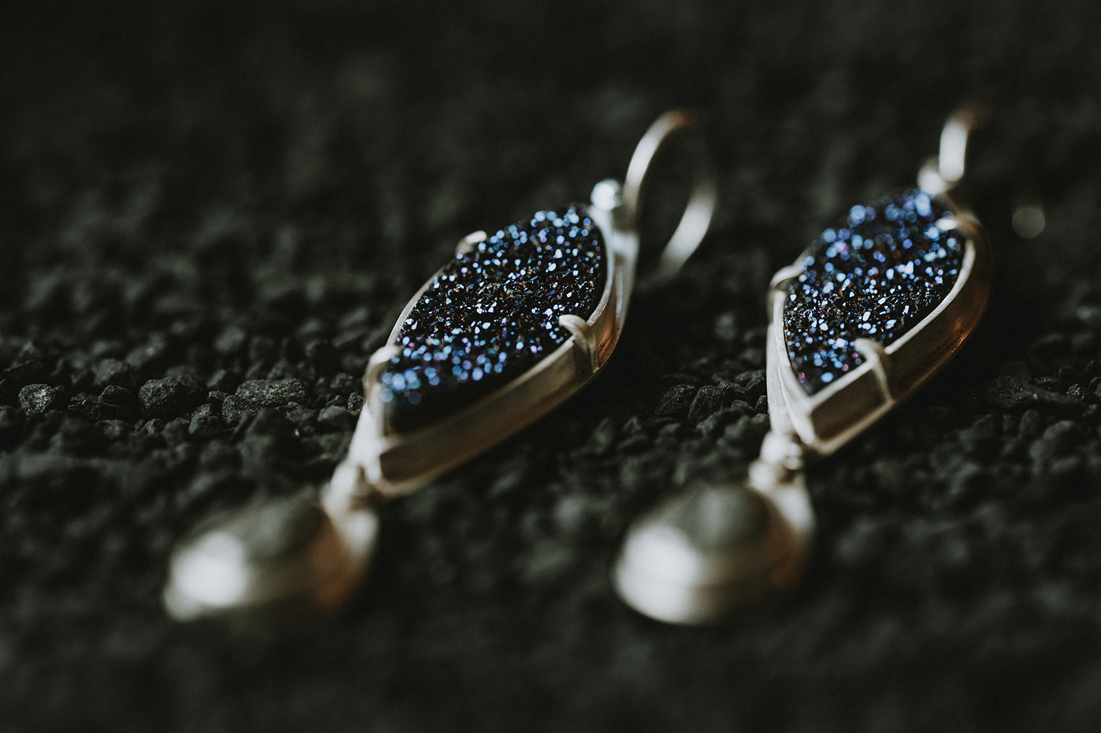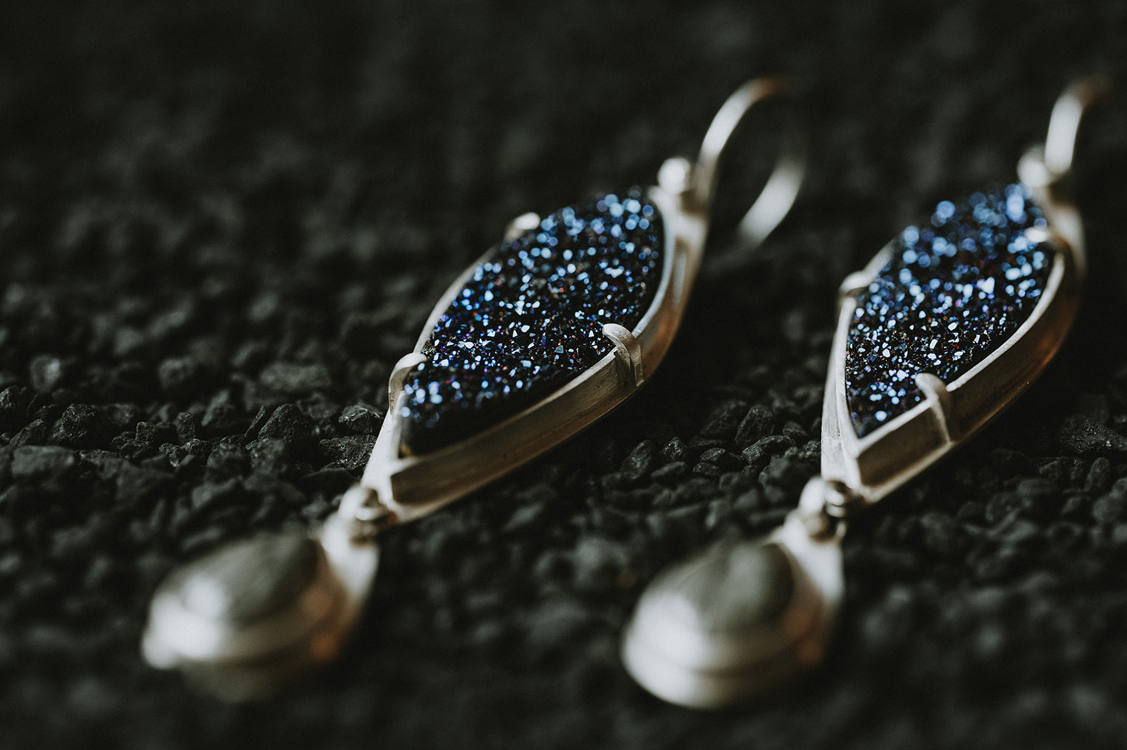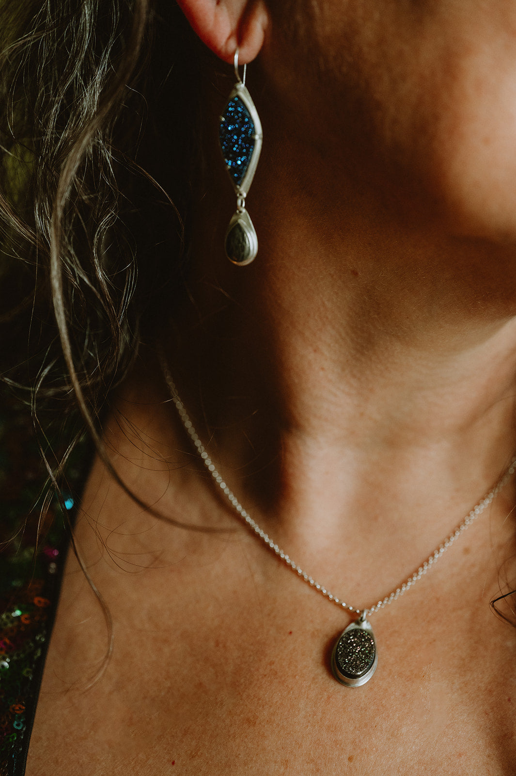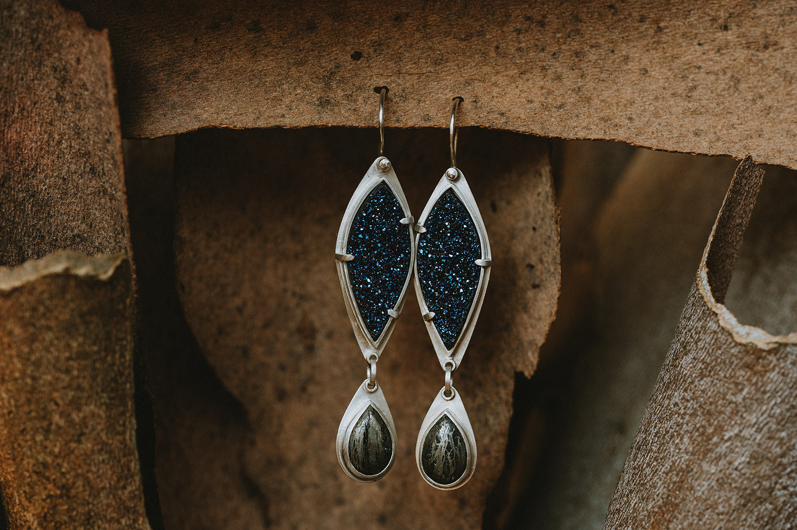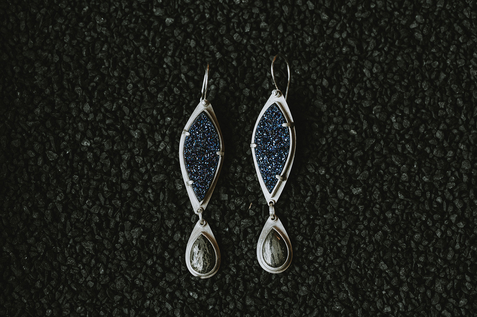 Earring Materials: Sterling silver, blue titanium-coated druzies, feathered pyrites