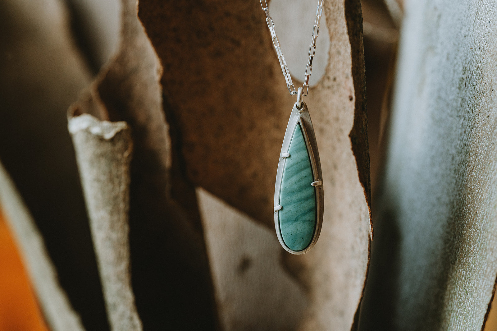 This necklace features a stunning blue-green jasper stone, its natural coloring reminiscent of rolling ocean waves. This sterling silver necklace with its unique pattern is a perfect gift for the nature-lover in your life.